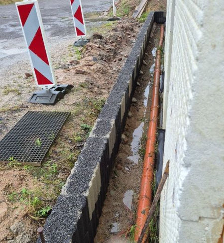 Es ist Samstag, der 18. Mai 2024. Die Arbeiten an der Außenanlage des Anbaus haben begonnen. Peter, Uwe und Günter haben mit Hilfe eines Kleinbaggers Erdreich ausgehoben. Daraus entsteht der Anfang der Umrandung aus Betonsteinen, die zum Abschluß auch mit Speiss gefüllt werden. So entstehen zum einen eine Treppe als auch eine Rampe für den gesicherten Zugang für Menschen mit einem Handicap. Die Entwässerungsrohre sind schon sichtbar, sie werden an der gesamten Außenwand verlegt, so bleibt unser Anbau trocken.
