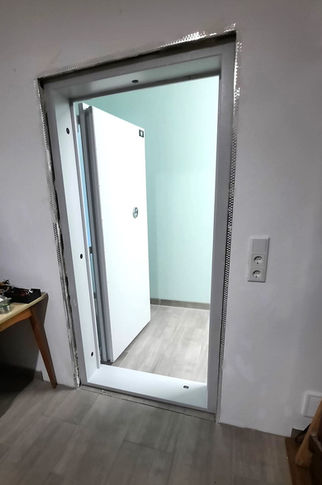 Am 23. April 2025 hat Uwe mit vielen starken Menschen und Hubwagen die Waffenkammertüre in den Flur gestellt. Nur 1 Tag später wurde die Zarge ausgerichtet, die Dübel gesetzt und der Rahmen verschraubt sowie geschäumt. Am nächsten Tag wurde die Türe eingehängt und die Zahlenschlösser eingestellt, fertig!!!