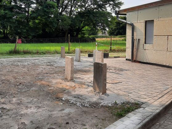 Die Arbeiten an der Außenanlage des Anbaus sind fließend fortgesetzt worden. Die Randsteine sind gesetzt und mit Beton verfüllt. Die Rampe zur Eingangstüre, auf der auch Sportler mit Handicap demnächst direkt ins Gebäude gelangen können, wurde im Laufe der letzten Tage gepflastert. Heute wurden durch Uwe und Günter wieder rund 8 qm Pflaster von der Einfahrt bis zur Außentreppe bei 32 °C Außentemperatur verlegt, das war Tauwetter für Dicke.🤠